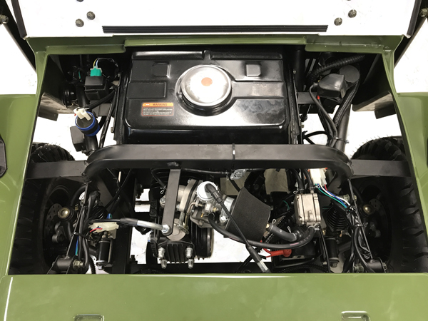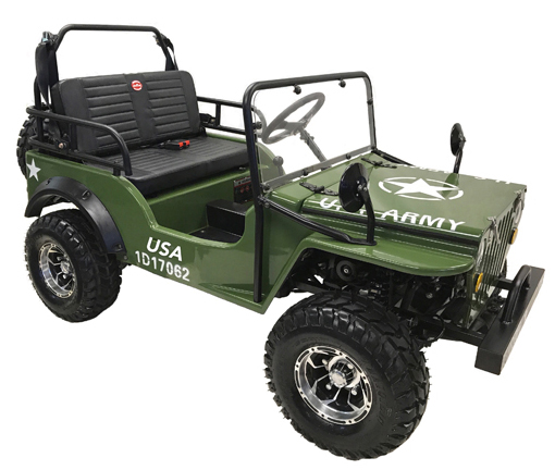 Simplistic strong design, our 123cc Mini Jeep has a Honda clone design overhead cam gas engine, Semi auto transmission, single independent front & rear disk brake, front crash bar, rugged rear suspension, engine protection bar, fully rose jointed steering, chain drive and padded drivers seat.